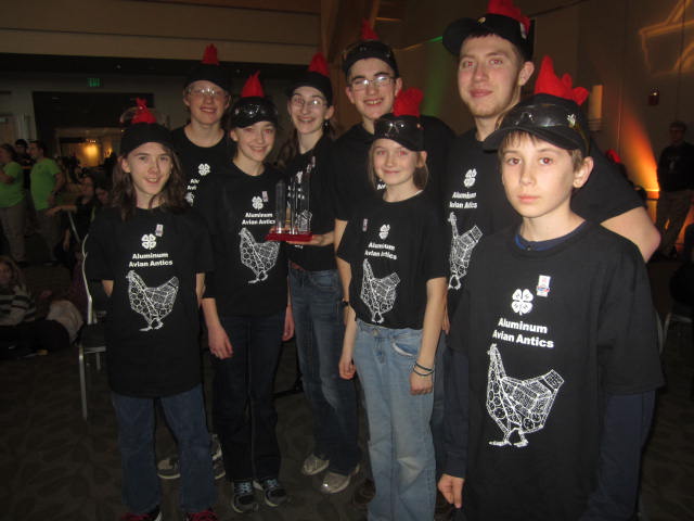| Our team with the Rockwell Collins Award, members from left to right: Trent, Liam, Grace, Madeline, Jack, Audrey (sibling), Josh, and John |